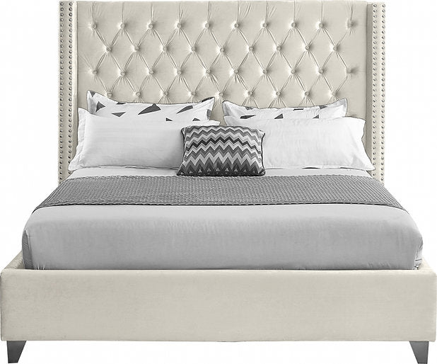 Introducing the Bed Creme Beige-IF 5892, where soft, luminous warmth meets sleek, modern brilliance. This contemporary wing bed blends the cozy embrace of a classic silhouette with the refined sparkle of chrome accents. Featuring deep button tufting, gleaming nailhead details, and slender chrome legs—all wrapped in rich, inviting creme velvet—this bed creates a serene focal point of plush comfort and understated glamour, designed for a soothing and sophisticated retreat.